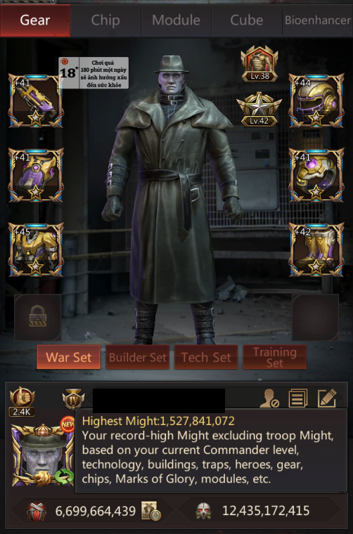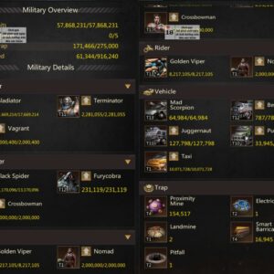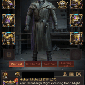 HQ43 | Fighter Base | 6,699B Might | 1,527B Highest Might | March Size 669,000 | Solo Lair 56 (65) | Tickets 70 | ID625 | Price: $20,000