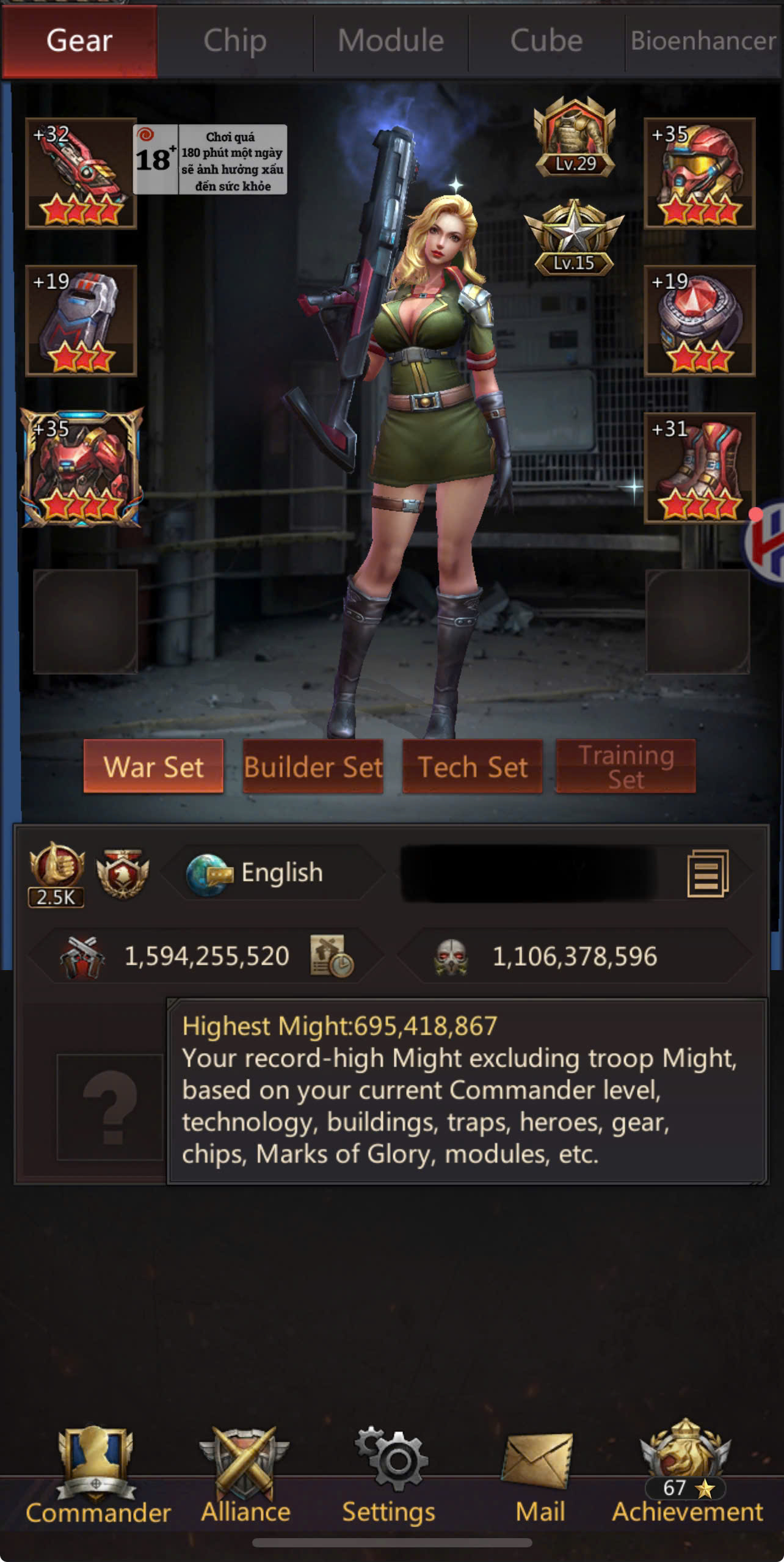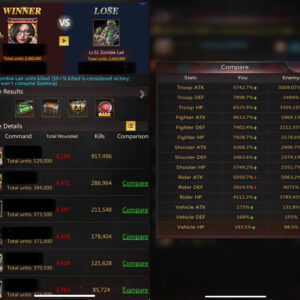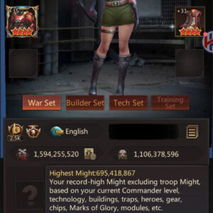 HQ40 | Fighter Base | 1,594B Might | 695M Highest Might | March Size 529,000 | Solo Lair 51 (75%) | Tickets 78 | ID669 | Price: $1,500